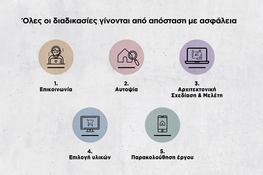 Έμπειροι αρχιτέκτονες της εταιρείας ΕΠΙΚΥΚΛΟΣ αναλαμβάνουν τη σχεδίαση της νέας σας κατοικίας, την οποία στη συνέχεια επικοινωνούν μαζί σας μέσω online ραντεβού. Με τη βοήθεια των βιντεοκλήσεων αλλά και των ηλεκτρονικών μηνυμάτων γίνεται η ανταλλαγή των πληροφοριών, μέχρι να καταλήξετε στην ιδανική λύση για τον χώρο σας.