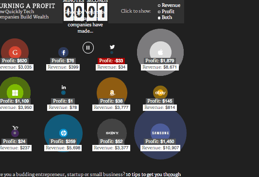 Στη παρακάτω εικόνα μπορείτε να δείτε ότι σε ένα μόλις δευτερόλεπτο η Apple βγάζει 1.997 δολάρια, η Google 658 το Facebook 81 δολάρια.