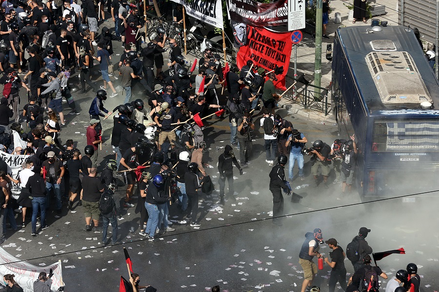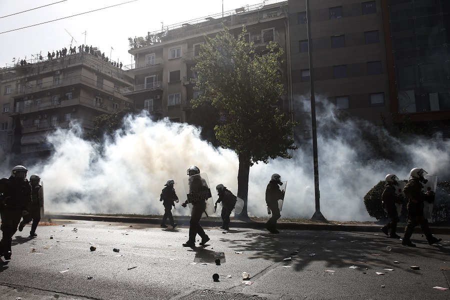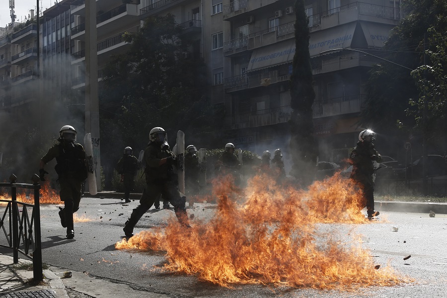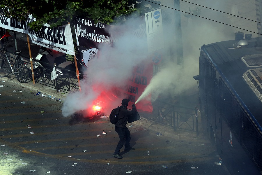 Ομάδα κουκουλοφόρων πετάει μολότοφ, καπνογόνα και διάφορα άλλα αντικείμενα προς τις αστυνομικές δυνάμεις.