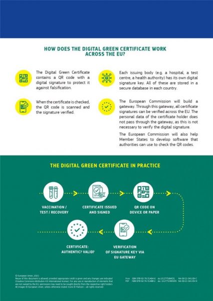 Τα πιστοποιητικά θα εκδίδονται σε ψηφιακή μορφή ή σε χαρτί. Και οι δύο θα έχουν έναν κωδικό QR που περιέχει τις απαραίτητες βασικές πληροφορίες καθώς και μια ψηφιακή υπογραφή για να βεβαιώνει ότι το πιστοποιητικό είναι αυθεντικό.