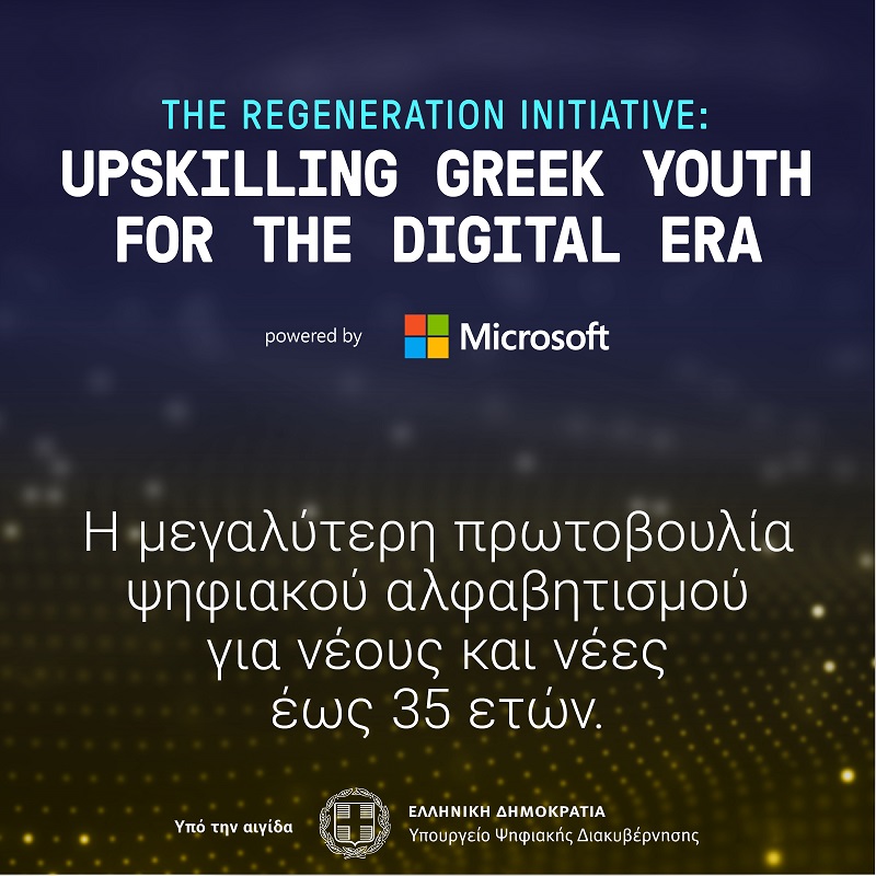 H Microsoft Ελλάδας, Κύπρου και Μάλτας και το ReGeneration ανακοινώνουν την έναρξη του εκπαιδευτικού προγράμματος “The ReGeneration Initiative: Upskilling Greek Youth for the Digital Era powered by Microsoft”, που υλοποιείται στο πλαίσιο της συνεργασίας των δύο οργανισμών για την πρωτοβουλία «GR for Growth» και έχει ως στόχο την ανάπτυξη (up/reskilling) νέων επαγγελματιών σε ψηφιακές δεξιότητες που είναι απαραίτητες για το μέλλον της εργασίας.