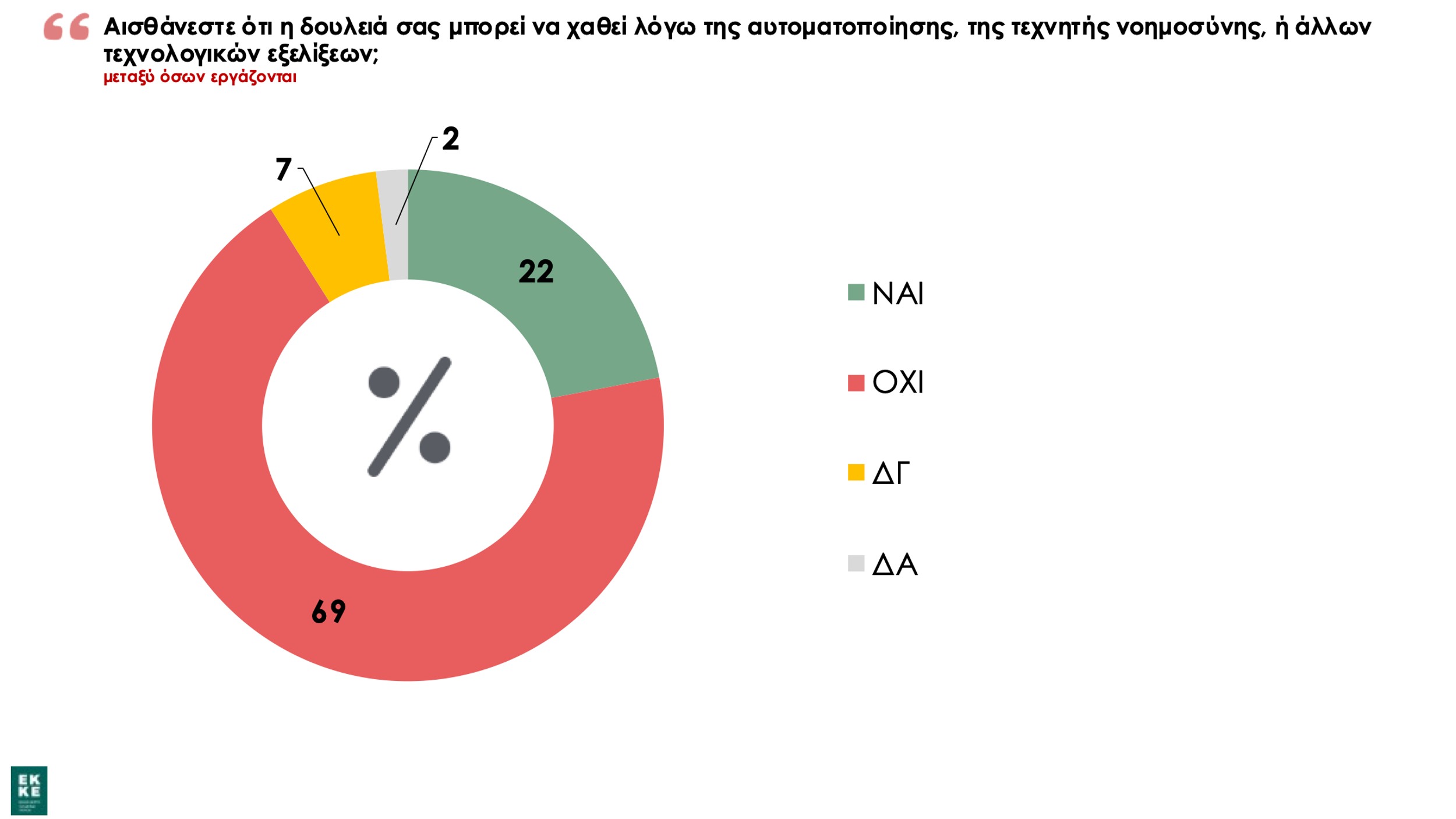 Αντλώντας από τα ευρήματα του WIP-GR 2022, το 69% των ερωτώμενων δεν θεωρεί ότι κινδυνεύει η εργασία του (Εικόνα 1), το οποίο ενδεχομένως σχετίζεται με το φαινόμενο της «ψευδαίσθησης του ελέγχου». Ο όρος αυτός επινοήθηκε το 1975, από την Αμερικανίδα ψυχολόγο Ellen J. Langer, επιχειρώντας να περιγράψει την ανθρώπινη ανάγκη να θεωρούμε ότι λύσεις που βρέθηκαν για συγκεκριμένα προβλήματα μπορούν να επιλύσουν και τις μελλοντικές προκλήσεις. Σε αυτό το πλαίσιο, τείνουμε να φανταζόμαστε ένα «κλειστό» ασφαλές μέλλον. Σημειωτέον ότι στα ίδια συμφραζόμενα με την «ψευδαίσθηση του ελέγχου» θα μπορούσε να ερμηνευθεί και το υψηλό ποσοστό (77%) σχετικά με την αίσθηση που έχουν οι ψηφιακοί χρήστες ότι μπορούν να διακρίνουν μια «ψευδή» (παραποιημένη) είδηση στο διαδίκτυο, ίσως μια μεροληψία αυτοπεποίθησης στην ικανότητα εντοπισμού του ψεύδους.