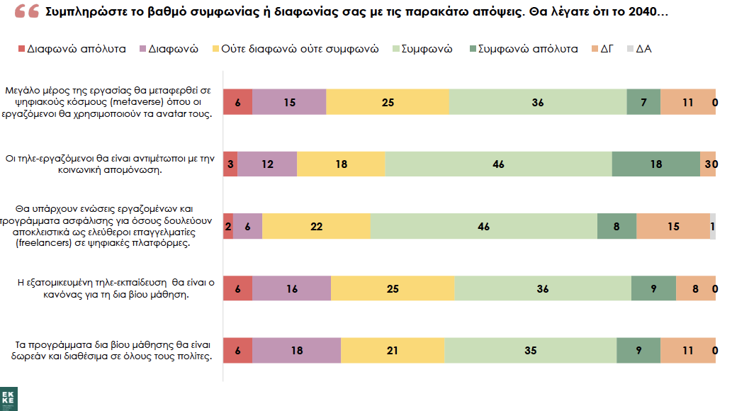Σε αντίθεση με το προηγούμενο εύρημα και εστιάζοντας στις αλλαγές που θα φέρουν οι εμβυθιστικές ψηφιακές πραγματικότητες μέχρι το 2040, φαίνεται ότι περίπου οι μισοί συμμετέχοντες της έρευνας αναμένουν ριζικές μεταβολές (Εικόνα 2). Πιο συγκεκριμένα, αναμένουν να μεταφερθεί ένα μεγάλο κομμάτι της εργασίας σε ψηφιακούς κόσμους και αναγνωρίζουν αναγκαίες αλλαγές που θα προκύψουν και σχετίζονται με (α) τα εργασιακά δικαιώματα των εργαζομένων σε ψηφιακές πλατφόρμες, (β) την εξατομίκευση της τηλε-εκπαίδευσης στο πεδίο της δια βίου μάθησης, και (γ) το πρόβλημα της κοινωνικής απομόνωσης των τηλε-εργαζομένων. Εντέλει, ένα εξαιρετικά σημαντικό ποσοστό (20-25%) αδυνατεί να φανταστεί το τι είναι πιθανό να συμβεί, κάτι που ίσως είναι και το σπουδαιότερο εύρημα της συγκεκριμένης έρευνας, καθώς αναδεικνύει την αδυναμία για ενεργοποίηση προς την αντιμετώπιση ή/και αξιοποίηση των αναδυόμενων προκλήσεων.