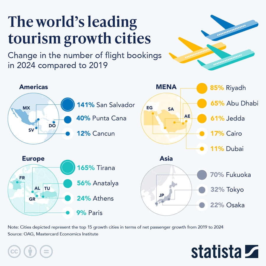 Στην Αμερικανική ήπειρο, το Σαν Σαλβαδόρ σημειώνει άνοδο +141%, ενώ στην περιοχή MENA, το Ριάντ (+85%), το Άμπου Ντάμπι (+65%) και η Τζέντα (+61%) αναδεικνύονται σε δυναμικούς νέους κόμβους. Στην Ασία, η Φουκουόκα (+70%) ξεπερνά ακόμη και το Τόκιο (+32%) και την Οσάκα (+22%).