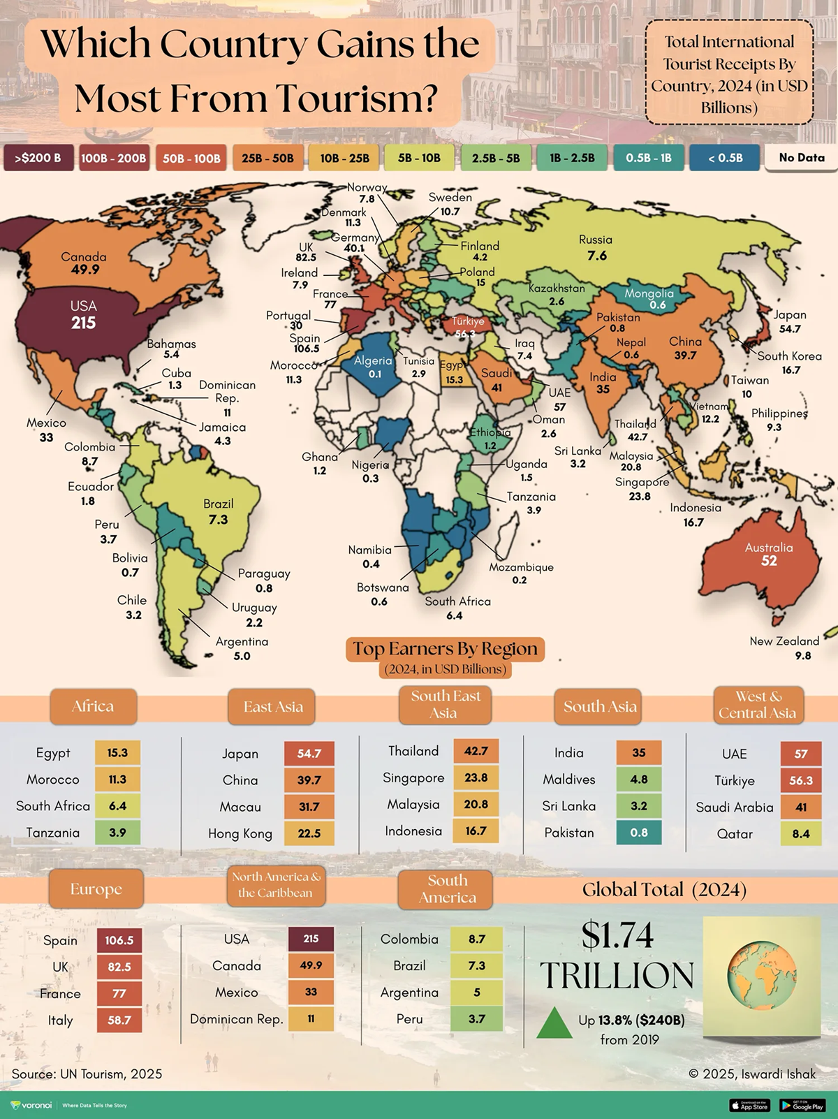 Αντίστοιχα, η Τουρκία (56,3 δισ. δολάρια), η Ιαπωνία (54,7 δισ.), η Αυστραλία (52 δισ.) και ο Καναδάς (49,9 δισ.) καταδεικνύουν ότι ο τουρισμός λειτουργεί ως πολυκεντρικό οικονομικό φαινόμενο, με ισχυρούς πόλους σε Ευρώπη, Ασία, Μέση Ανατολή και Βόρεια Αμερική.