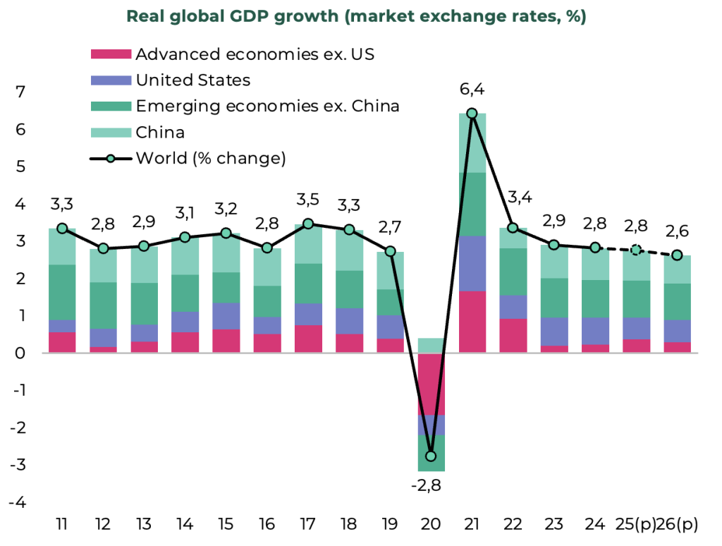 Η δυναμική της παγκόσμιας οικονομίας παρουσιάζει διακυμάνσεις ενόψει του 2026. Αναμένουμε ανάπτυξη +2,6% φέτος – μια πολύ μικρή μείωση σε σχέση με το +2,8% το 2025 – παρά το διεθνές περιβάλλον που χαρακτηρίζεται από επίμονους γεωπολιτικούς, οικονομικούς και κοινωνικούς κινδύνους.