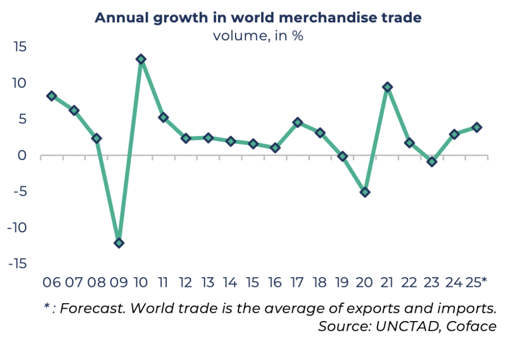 Παρά τις ανησυχίες που προκλήθηκαν από τις δασμολογικές επιθέσεις των ΗΠΑ, το παγκόσμιο εμπόριο εξέπληξε αρκετούς το 2025, με αύξηση 3,9% στον όγκο συναλλαγών λόγω των ισχυρών εισαγωγών από τις ΗΠΑ και αύξηση των τελωνειακών δασμών των ΗΠΑ, η οποία τελικά αποδείχθηκε χαμηλότερη από ό,τι αρχικά φοβόταν. Ο πραγματικός μέσος δασμολογικός συντελεστής ανήλθε στο 9,4% τον Νοέμβριο, σε σύγκριση με το αναμενόμενο 36% στο αποκορύφωμα των εντάσεων με την Κίνα.