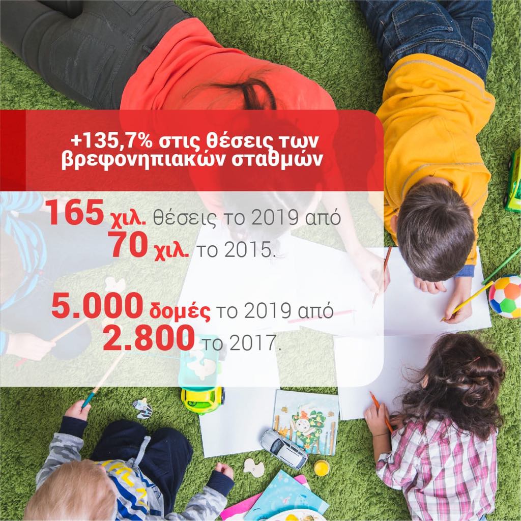 Αύξηση 135,7% στις θέσεις των βρεφονηπιακών σταθμών: 165 χιλ. θέσεις το 2019 από 70 χιλ. το 2015. 5.000 δομές το 2019 από 2.800 το 2017.