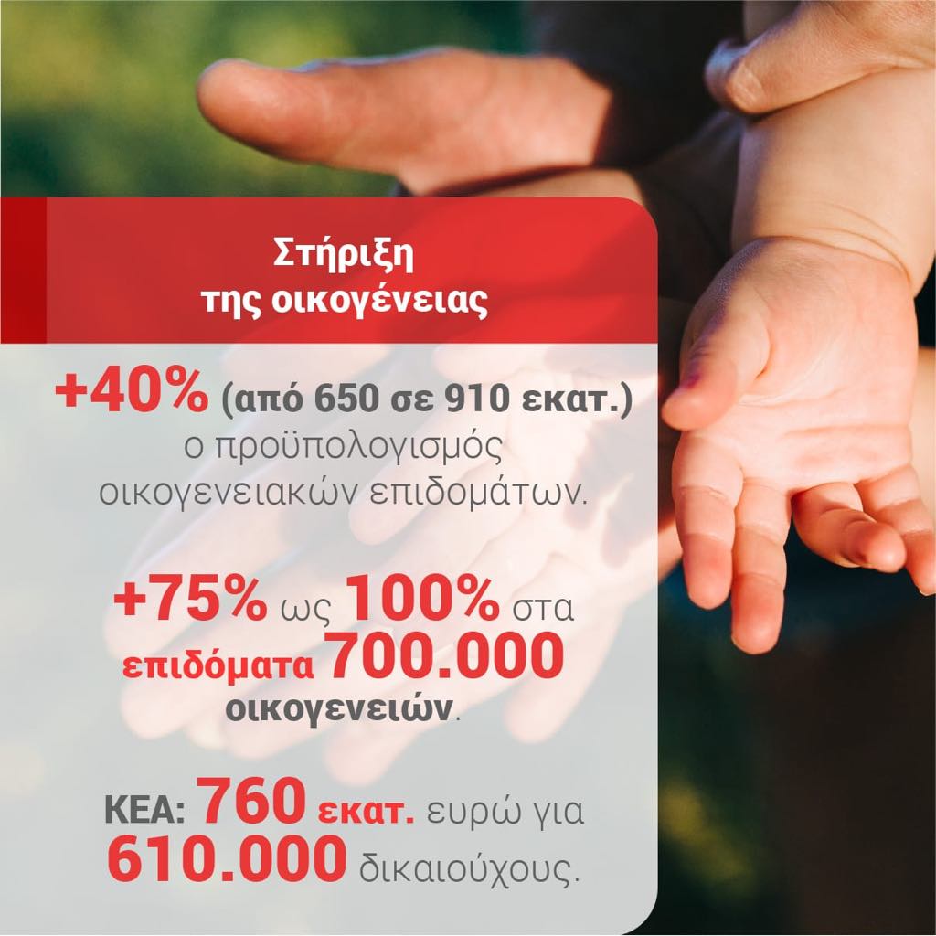 Στήριξη της οικογένειας: Αύξηση 40% (από 650 σε 910 εκατ.), ο προϋπολογισμός των οικογενειακών επιδομάτων. Αύξηση 75% ως 100% στα επιδόματα 700.000 οικογενειών. ΚΕΑ: 760 εκατ. ευρώ για 610.000 δικαιούχους.
