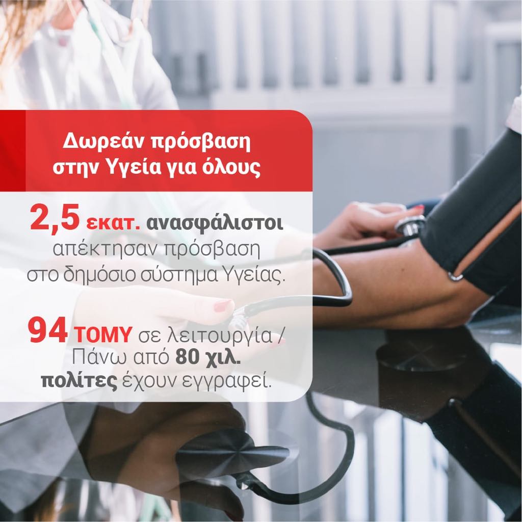 2,5 εκατ. ανασφάλιστοι απέκτησαν πρόσβαση στο Δημόσιο Σύστημα Υγείας. 94 ΤΟΜΥ σε λειτουργία/ Πάνω από 80 χιλ. πολίτες έχουν εγγραφεί.