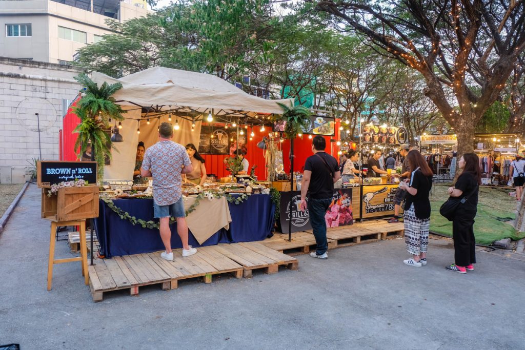 BANGKOK,THAILAND-March 2019-People and Tourist walking, buying food at outdoor street food night market in the Park. Market Stalls. Outdoor market. Food Event. Food Fair. Festival. Flea Market. Bazaar
