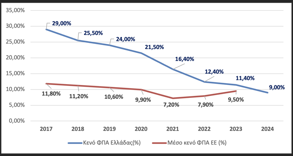 - Η πτωτική τάση του κενού ΦΠΑ στην Ελλάδα συνεχίζεται, με τις προκαταρκτικές εκτιμήσεις για το 2024 να προβλέπουν περαιτέρω μείωσή του στο 9,0%.
