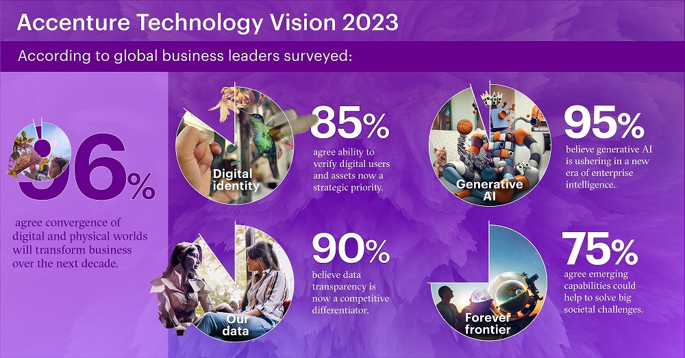 «Η επόμενη δεκαετία θα οριστεί από τρεις μεγάλες τεχνολογικές τάσεις -το cloud, το metaverse και την τεχνητή νοημοσύνη- οι οποίες συνδυαστικά θα εκμηδενίσουν την απόσταση μεταξύ του ψηφιακού και φυσικού μας κόσμου», δήλωσε ο Paul Daugherty, Group Chief Executive της Accenture Technology. «Ενώ η γενετική τεχνητή νοημοσύνη θα έχει εκτεταμένο αντίκτυπο, οι ηγέτες των επιχειρήσεων θα πρέπει να κινηθούν άμεσα προκειμένου να αξιοποιήσουν στο έπακρο τις δυνατότητές της, καθώς θα απαιτηθούν σημαντικές επενδύσεις σε δεδομένα, ανθρώπους και προσαρμογή δομικών μοντέλων για την ανταπόκριση στις μοναδικές ανάγκες κάθε οργανισμού».