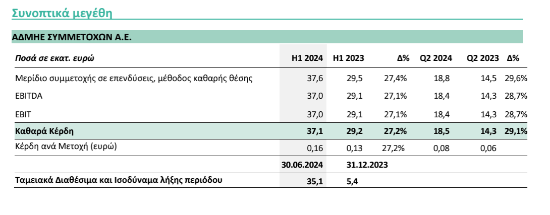 ” Το πρώτο εξάμηνο του έτους συνεχίστηκε η θετική πορεία των αποτελεσμάτων της ΑΔΜΗΕ Συμμετοχών, με σημαντική αύξηση των εσόδων κατά 27,4% στα 37,6 εκατ. ευρώ και των κερδών ανά μετοχή στα 0,16 ευρώ, από 0,13 την ίδια περίοδο το 2023, ενώ ο δανεισμός παρέμεινε μηδενικός.