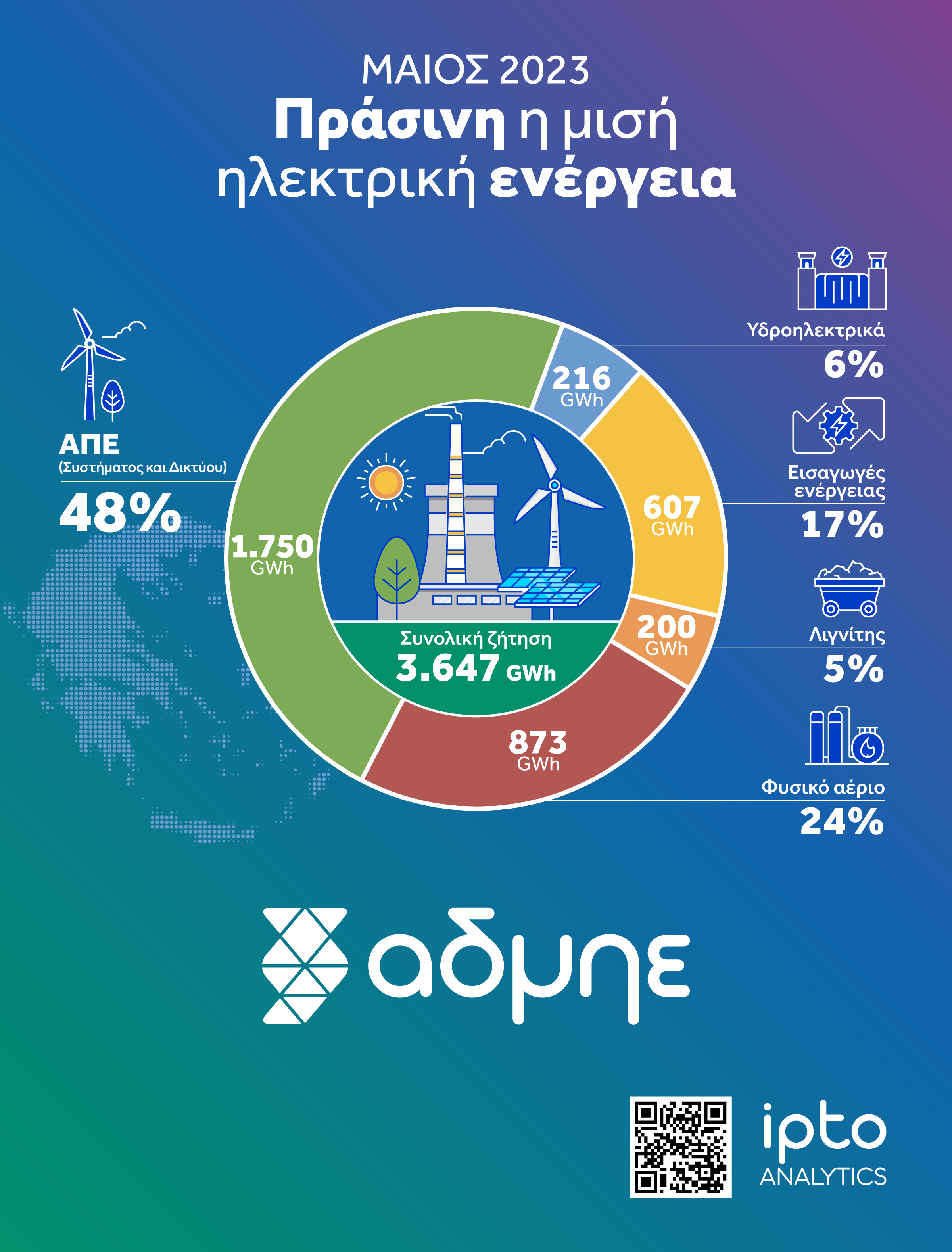 Νέο ιστορικό υψηλό τον Μάιο 2023 κατέγραψαν οι ΑΠΕ συμμετέχοντας κατά 48% -σχεδόν κατά το ήμισυ- στο ενεργειακό μείγμα, ενώ η παραγωγή από λιγνίτη ήταν μόλις 5%, όπως προκύπτει από τα μηνιαία στοιχεία του ΑΔΜΗΕ.