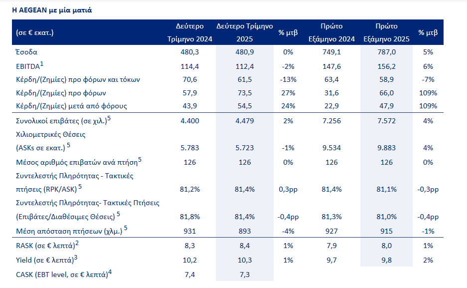 Το Β’ Τρίμηνο η AEGEAN προσέφερε 5,5 εκατ. θέσεις, μόλις 2% περισσότερες σε σχέση με το 2024 κυρίως λόγω της απώλειας των αγορών στη Μέση Ανατολή που αναφέρθηκε ανωτέρω, με την επιβατική κίνηση να αυξάνεται επίσης κατά 2%. Ο συντελεστής πληρότητας διαμορφώθηκε στο 81,4%. Ο ενοποιημένος κύκλος εργασιών για το Β’ Τρίμηνο ανήλθε σε €480,9 εκατ., ενώ το EBITDA διαμορφώθηκε σε €112,4 εκατ. Τα καθαρά κέρδη μετά από φόρους ανήλθαν σε €54,5 εκατ., αυξημένα από €43,9 εκατ. το Β’ Τρίμηνο του 2024.