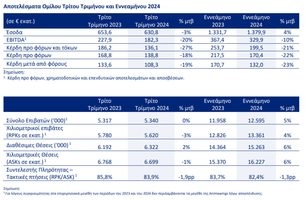 Ο ενοποιημένος Κύκλος Εργασιών για το εννεάμηνο του 2024 ανήλθε σε €1,38 δισ., αυξημένος κατά 4% σε σχέση με το αντίστοιχο διάστημα του 2023. Ο Όμιλος προσέφερε 15,3 εκατ. διαθέσιμες θέσεις και μετέφερε 12,6 εκατ. επιβάτες, 5% περισσότερους σε σχέση με την περσινή περίοδο, εκ των οποίων 7,4 εκατ. επιβάτες από/προς προορισμούς του εξωτερικού. Τα Κέρδη ΕΒΙΤDA διαμορφώθηκαν σε €330 εκατ., τα Κέρδη προ Φόρων ανήλθαν στα €170,4 εκατ. ενώ τα Κέρδη μετά από Φόρους του εννεαμήνου ανήλθαν στα €132,0 εκατ., 23% χαμηλότερα εκατ. την αντίστοιχη περίοδο του 2023.