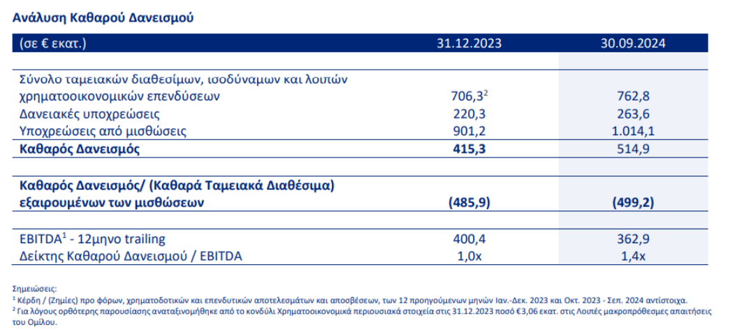 Τα ταμειακά διαθέσιμα, ισοδύναμα και λοιπές χρηματοοικονομικές επενδύσεις διαμορφώθηκαν σε €762,8 εκατ.1 στις 30.09.2024.