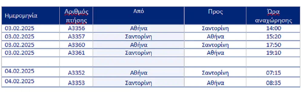 Σημειώνεται ότι και οι τέσσερις τακτικές, προγραμματισμένες καθημερινές πτήσεις από και προς τη Σαντορίνη θα εκτελούνται κανονικά και σύμφωνα με τον αρχικό προγραμματισμό.