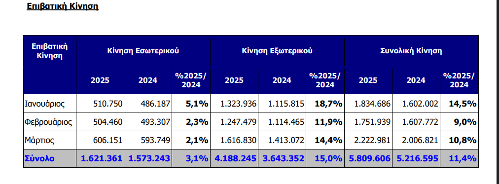 Για τον Μάρτιο η επιβατική κίνηση του αεροδρομίου της Αθήνας ανήλθε σε 2,22 εκατ., αυξημένη κατά 10,8% σε σύγκριση με το 2024.