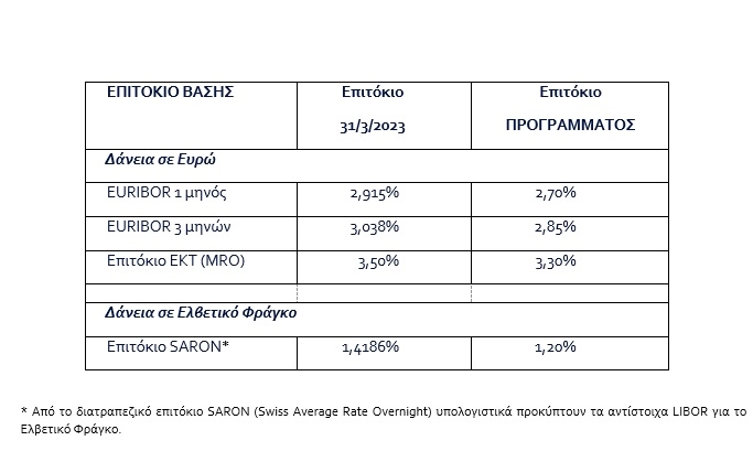 Ενδεικτικά, τα επιτόκια αναφοράς του προγράμματος διαμορφώνονται ως ακολούθως: EURIBOR 1 μηνός στο 2,72% και EURIBOR 3 μηνών στο 2,83%, από 2,92% και 3,03% αντίστοιχα στα τέλη Μαρτίου.