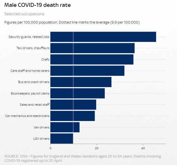 Οι άνδρες σεκιούριτι, οι σεφ και οι οδηγοί ταξί είναι, σύμφωνα με έρευνα, ανάμεσα στις κατηγορίες που είναι πιο ευάλωτες στον κορωνοϊό, τουλάχιστον στο Ηνωμένο Βασίλειο. Οι άνθρωποι που δουλεύουν στην οικοδομή, οι οδηγοί λεωφορείων και πούλμαν αλλά και οι εργαζόμενοι σε εργοστάσια είναι επίσης οι επαγγελματίες εκείνοι που εμφανίζουν τα υψηλότερα ποσοστά θανάτου από κορωνοϊό, σύμφωνα με τα στοιχεία που έδωσε στην δημοσιότητα η Εθνική Στατιστική Υπηρεσία της χώρας και δημοσιεύει το Sky News.