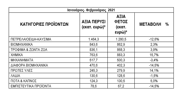 Ως αποτέλεσμα των παραπάνω, το εμπορικό έλλειμμα στο διάστημα Ιανουαρίου-Φεβρουαρίου του 2021 μειώθηκε κατά 1 δισ. ευρώ ή κατά -28%, στα -2,60 δισ. ευρώ από -3,60 δισ. ευρώ το αντίστοιχο διάστημα του 2020. Χωρίς τα πετρελαιοειδή, το εμπορικό έλλειμμα μειώθηκε στα -2,16 δισ. ευρώ από -2,79 δισ. ευρώ, δηλαδή κατά 63 εκατ. ευρώ ή κατά -22,6%.