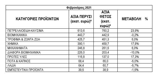 Σχετικά με τις μεγάλες κατηγορίες προϊόντων, το Φεβρουάριο του 2021 καταγράφονται ανοδικές τάσεις για τους σημαντικότερους κλάδους. Εξαίρεση αποτελούν πέντε κατηγορίες προϊόντων που σημειώνουν μείωση: Συγκεκριμένα, μεγάλη ποσοστιαία αύξηση καταγράφεται στα Πετρελαιοειδή-Καύσιμα (+23,9%), στα Χημικά (+17,8%) και στις Πρώτες Ύλες (+17,3%).