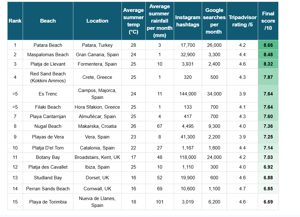 Η ομάδα της VIP Grinders βασίστηκε σε 30 από τις δημοφιλέστερες γυμνιστικές παραλίες στην Ευρώπη, χρησιμοποιώντας λίστες από τα TUI, Daily Mail και Express. Η αξιολόγηση έγινε βάσει πέντε παραμέτρων: μέση καλοκαιρινή θερμοκρασία, μέσο ύψος βροχόπτωσης, αριθμός hashtags στο Instagram, μέση βαθμολογία στο TripAdvisor και αριθμός μηνιαίων αναζητήσεων στο Google.