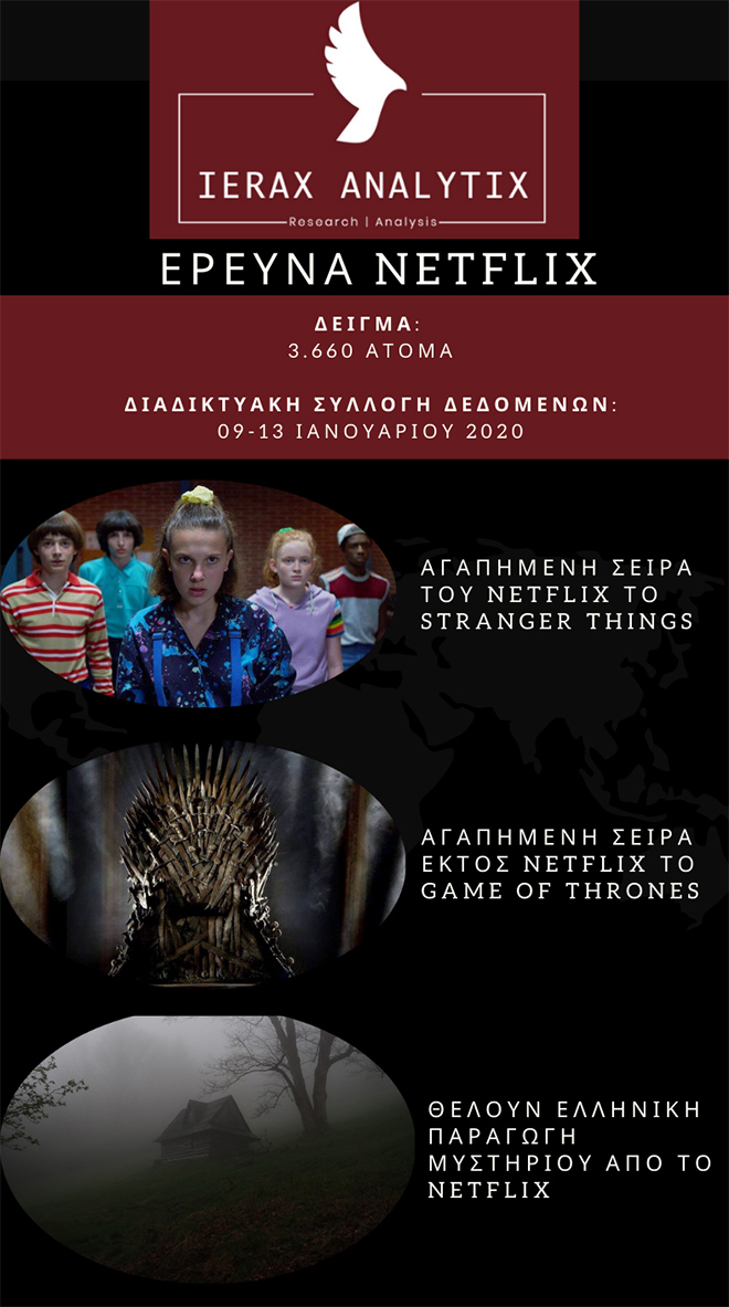 Η αγαπημένη σειρά των Ελλήνων στο Netflix είναι το Stranger Things. Η Eleven και η παρέα της είναι η αγαπημένη σειρά για το 9% των ατόμων που πήραν μέρος στην έρευνα της ierax analytix σχετικά με το Netflix. Αναφορικά με την πρώτη δεκάδα, μετά το Stranger Things έρχονται στη 2η θέση το La Casa de Papel με 8%, The Witcher με 7%, Peaky Blinders και Lucifer στο 5%, You και Dark στο 4%, Elite, Breaking Bad και Friends στο 3%. Πάνω από 100 τίτλοι εμφανίστηκαν ως αγαπημένοι, γεγονός που δείχνει το υψηλό επίπεδο των σειρών στο Netflix.