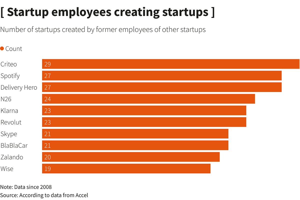 Κορυφαίες startups όπως BlaBlaCar, Criteo (CRTO.O), Delivery Hero (DHER.DE), Klarna, N26, Revolut, Skype, Spotify (SPOT.N) και Zalando (ZALG.DE) έχουν δημιουργήσει πρόσφορο έδαφος, αφού κάθε μία από αυτές τις εταιρείες οδήγησε στη δημιουργία περισσότερων από 20 νεοφυών επιχειρήσεων με επικεφαλής πρώην εργαζόμενους.