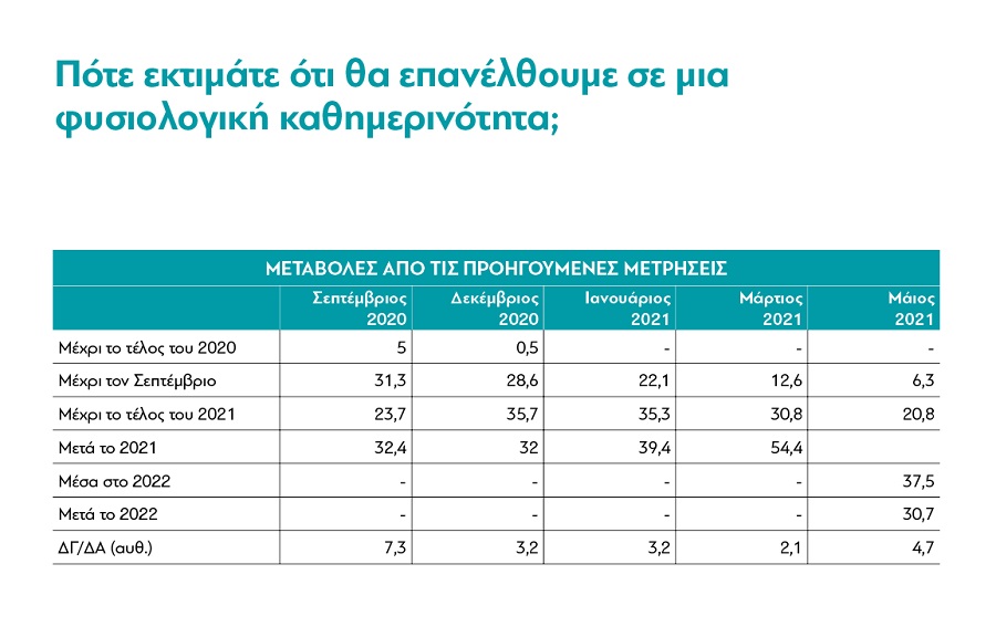 Και πλέον οι προσδοκίες τους για την εξέλιξη της κρίσης είναι ρεαλιστικές και προσγειωμένες. Ενώ τον Απρίλιο του 2020 7 στους 10 Έλληνες πίστευαν ότι θα έχουμε επανέλθει σε μια κανονική καθημερινότητα μέχρι τον Σεπτέμβριο του 2020, σήμερα 7 στους 10 Έλληνες πιστεύουν ότι θα επανέλθουμε σε μια κανονική καθημερινότητα κάποια στιγμή από το 2022 και μετά. 1 στους 3, μάλιστα, πιστεύουν πια ότι θα επανέλθουμε κάποια στιγμή “μετά το 2022”.
