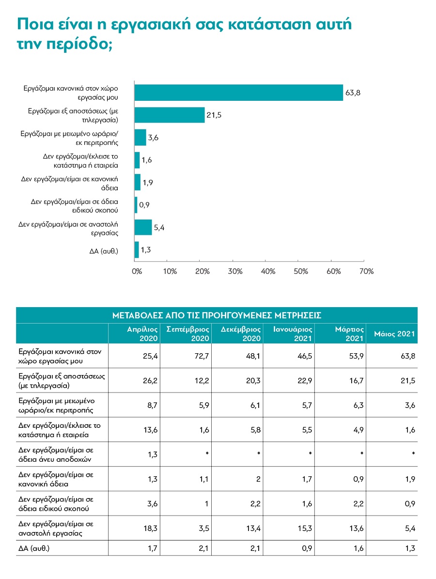 Όπως αναφέρει η διαΝΕΟσις, μια μορφή “κανονικότητας” πλέον επιστρέφει, τουλάχιστον σε κάποιες πτυχές της κοινωνικής και οικονομικής δραστηριότητας. Όπως φαίνεται από την έρευνα, πλέον σχεδόν 2 στους 3 Έλληνες εργάζονται κανονικά με φυσική παρουσία στον χώρο εργασίας τους (63,8%, από 53,9% τον περασμένο Μάρτιο και μόλις 25,4% τον Απρίλιο του 2020, εν μέσω εκείνου του πρώτου, αξέχαστου lockdown), ενώ 1 στους 5 εργάζονται ακόμη με τηλεργασία. Η μεγάλη αλλαγή, βεβαίως, είναι το ότι έχει μειωθεί πάρα πολύ ο αριθμός των εργαζομένων που βρίσκονται σε κάποια μορφή άδειας ή αναστολής.