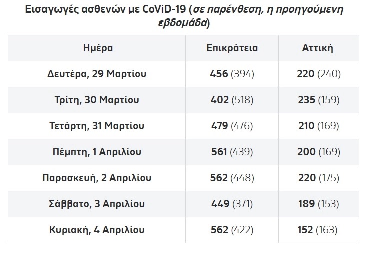Την προηγούμενη εβδομάδα, ο μέσος ημερήσιος αριθμός εισαγωγών ήταν 438 στην Επικράτεια για να φτάσει στις 496. Στην Αττική, ήταν 175 και έφτασε στις 204. Οι αριθμοί, ωστόσο, έχουν μεγάλη διακύμανση, σημειώνοντας ημερήσιες διαφορές έως και πάνω από 25%.