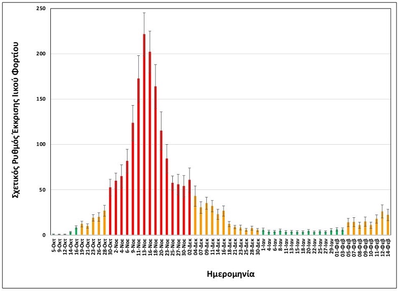 Η μέση τιμή συγκέντρωσης του ιικού φορτίου την εβδομάδα από 8 έως 14 Φεβρουαρίου είναι κατά 70% αυξημένη σε σχέση με τη μέση τιμή της προηγούμενης εβδομάδας, 1 με 7 Φεβρουαρίου. Σε ημερήσια βάση, η υψηλότερη τιμή καταγράφεται την Παρασκευή 12 Φεβρουαρίου.