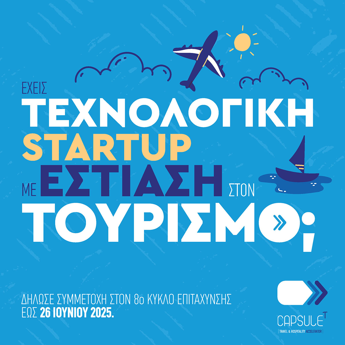Αν έχετε μια καινοτόμα ιδέα στον τουριστικό τομέα και επιθυμείτε να την αναπτύξετε με την υποστήριξη ενός δυναμικού οικοσυστήματος, οι αιτήσεις για τον 8ο κύκλο του CapsuleT είναι ανοιχτές! Το πρόγραμμα προσφέρει mentoring, workshops, δικτύωση με επαγγελματίες του κλάδου και ευκαιρίες για χρηματοδότηση.