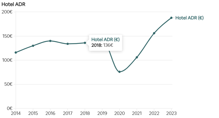 Πηγή: Πορτάλ δεδομένων του Δήμου Βαρκελώνης: Μέση τιμή δωματίου ανά κράτηση (ADR; €) τον Οκτώβριο του 2023, 188,8€ σε σύγκριση με 116€ τον Οκτώβριο του 2014.