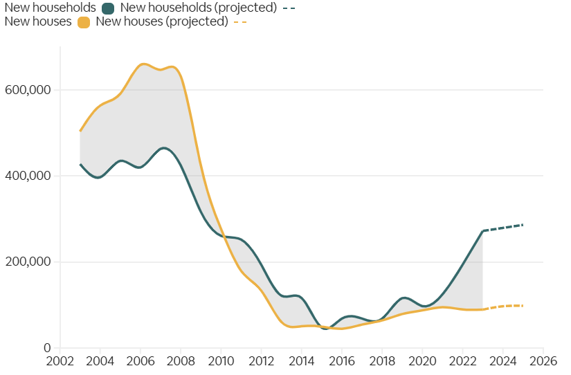 Πηγή: Εθνική Στατιστική Υπηρεσία και Υπουργείο Στέγασης, (1) Οι νέες μονάδες κατοικίας περιλαμβάνουν τόσο ολοκληρωμένα σπίτια ελεύθερης αγοράς όσο και τελικές πιστοποιήσεις προστατευμένων κατοικιών, (2) Για την πρόβλεψη στέγασης για τα επόμενα δύο χρόνια, εμφανίζονται οι μονάδες κατοικίας που ξεκίνησαν δύο χρόνια νωρίτερα.