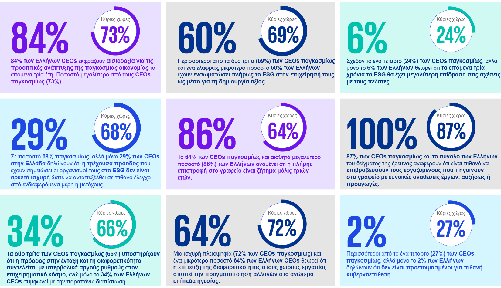 Σύμφωνα με τα ευρήματα της έρευνας, οι Έλληνες CEOs φαίνεται να συμμερίζονται την αισιοδοξία των CEOs παγκοσμίως για τις προοπτικές ανάπτυξης της παγκόσμιας οικονομίας, της χώρας και της εταιρείας τους. Ωστόσο, σε ένα γεωπολιτικά κατακερματισμένο κόσμο κατατάσσουν τη γεωπολιτική και πολιτική αβεβαιότητα υψηλά στις προκλήσεις που καλούνται να αντιμετωπίσουν.