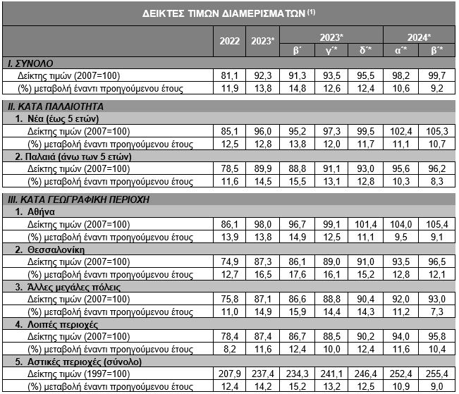 Με βάση τα διαθέσιμα προσωρινά στοιχεία, εκτιμάται ότι το β΄ τρίμηνο του 2024 οι τιμές των διαμερισμάτων (σε ονομαστικούς όρους) ήταν κατά μέσο όρο αυξημένες κατά 9,2% σε σύγκριση με το αντίστοιχο τρίμηνο του 2023. Για το 2023, οι τιμές των διαμερισμάτων αυξήθηκαν με μέσο ετήσιο ρυθμό 13,8% (αναθεωρημένα στοιχεία), έναντι αύξησης 11,9% το 2022.