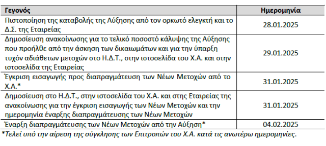 Το αναμενόμενο χρονοδιάγραμμα της ολοκλήρωσης της Αύξησης και της εισαγωγής προς διαπραγμάτευση των Νέων Μετοχών είναι το εξής: