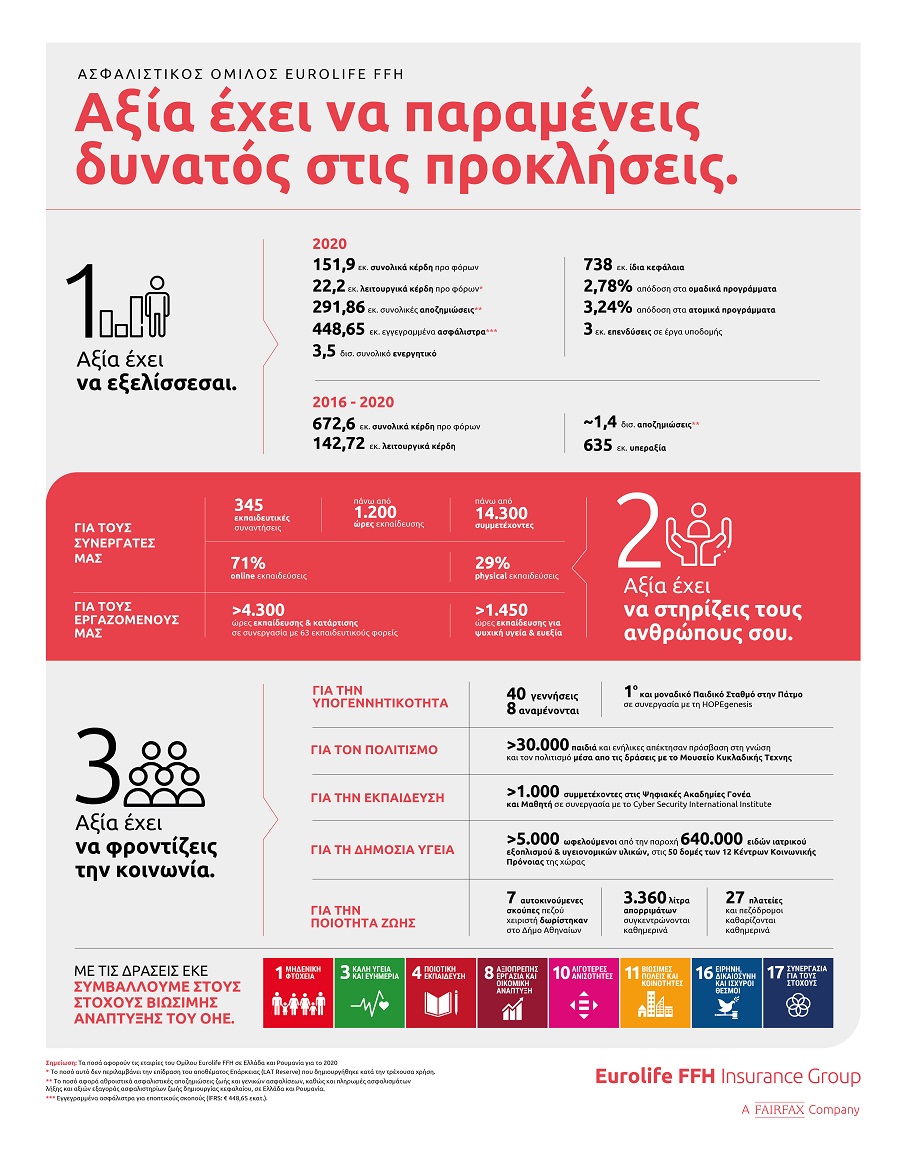 Σε ένα δύσκολο κοινωνικοοικονομικό περιβάλλον στο οποίο πρωταγωνιστικό ρόλο έπαιξαν η πανδημία, αλλά και οι τεράστιες φυσικές καταστροφές που συντελέστηκαν στη χώρα μας το 2020, ο όμιλος Eurolife FFH, μέλος της Fairfax Financial Holdings Limited κατάφερε και διατήρησε την ηγετική του θέση στην αγορά, πέτυχε θετικά οικονομικά αποτελέσματα και συνέχισε σταθερά να εφαρμόζει το πλάνο ανάπτυξής του.