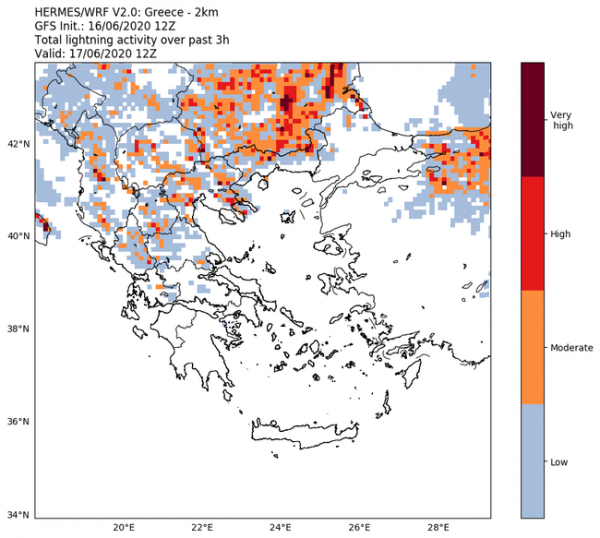Συστήνεται προσοχή κατά τις ώρες εκδήλωσης καταιγίδων λόγω των ισχυρών ριπαίων ανέμων που πιθανώς θα τις συνοδεύουν αλλά κυρίως λόγω της έντονης κεραυνικής δραστηριότητας που αναμένεται. Όπως προκύπτει από τον ενδεικτικό χάρτη που ακολουθεί και παρουσιάζει την κεραυνική δραστηριότητα το μεσημέρι της Τετάρτης 17/06, έντονη κεραυνική δραστηριότητα αναμένουμε κυρίως στα κεντρικά και βόρεια ηπειρωτικά.