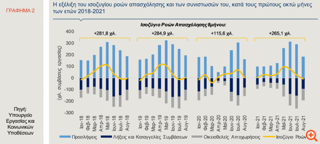 Όπως παρατηρείται στο Γράφημα 2, το οποίο περιλαμβάνει στοιχεία πρώτου οκταμήνου, το χρονικό μοτίβο προσλήψεων-αποχωρήσεων -που παραδοσιακά προσδιορίζεται σε μεγάλο βαθμό από το εποχικό πρότυπο του ελληνικού τουρισμού- φαίνεται να επανέρχεται σταδιακά στην εικόνα των ετών 2018-2019, μετά τη μεγάλη διαταραχή του 2020. Επιπρόσθετα, η καθαρή διαφορά τους, δηλαδή το ισοζύγιο των ροών απασχόλησης ανήλθε σε 265,1 χιλ. νέες θέσεις απασχόλησης το πρώτο οκτάμηνο του 2021, έναντι 115,6 χιλ. το ίδιο διάστημα του 2020 και 284,9 χιλ. το διάστημα Ιανουαρίου-Αυγούστου 2019. Όπως αναμενόταν, οι κλάδοι με τις μεγαλύτερες αυξήσεις σε όρους κύκλου εργασιών, το πρώτο επτάμηνο του 2021, όπως τα καταλύματα, οι υπηρεσίες εστίασης και το λιανικό εμπόριο, είχαν και τα μεγαλύτερα κέρδη σε όρους απασχόλησης το ίδιο περίπου χρονικό διάστημα και συγκεκριμένα από τον Μάρτιο έως και τον Ιούλιο, όπως αποτυπώνεται στα στοιχεία του ισοζυγίου ροών απασχόλησης.
