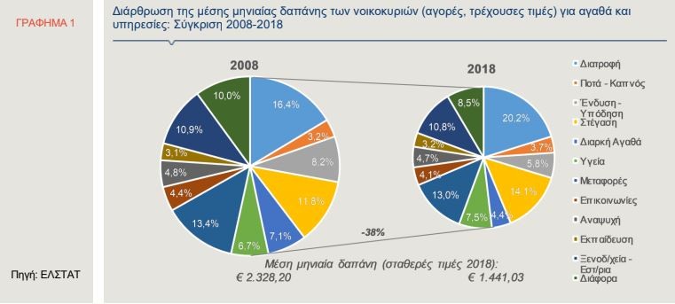 Σύμφωνα με την έρευνα οικογενειακών προϋπολογισμών της ΕΛΣΤΑΤ, το 2018 η μέση μηνιαία δαπάνη των νοικοκυριών για αγορές (σε σταθερές τιμές 2018), ανήλθε στα € 1.441,03, καταγράφοντας αύξηση κατά 1,3%, σε σύγκριση με το 2017. Στο Γράφημα 1 αποτυπώνεται η κατανομή της μέσης μηνιαίας δαπάνης για αγαθά και υπηρεσίες, τόσο για το 2018, όσο και για το 2008, δηλαδή πριν την οικονομική κρίση.