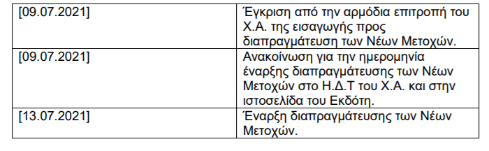 Το αναμενόμενο χρονοδιάγραμμα της διαδικασίας εισαγωγής παραμένει σύμφωνα με την από 2.7.2021 ανακοίνωση της Εταιρείας, ως εξής: