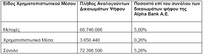 Η Alpha Bank ανακοίνωσε ότι η BlackRock, Inc., κατόπιν της από 19.11.2019 σχετικής γνωστοποιήσεώς της, κατέχει έμμεσα από την 18.11.2019 δικαιώματα ψήφου τα οποία αντιστοιχούν σε ισάριθμες κοινές, ονομαστικές, μετά ψήφου, άυλες μετοχές, καθώς και άλλα χρηματοπιστωτικά μέσα τα οποία παρέχουν δικαίωμα αποκτήσεως μετοχών που ενσωματώνουν δικαιώματα ψήφου, σε ποσοστό άνω του ορίου του 5% επί του συνόλου των δικαιωμάτων ψήφου της Τραπέζης, αφαιρουμένων αυτών που κατέχει το ΤΧΣ.