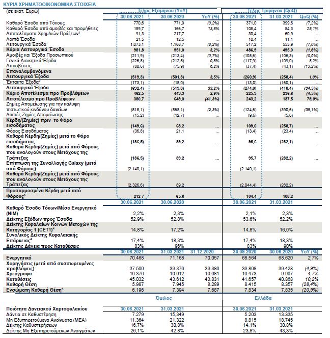 Συμπεριλαμβανομένων των ζημιών που προέκυψαν από τη συναλλαγή Galaxy, το Αποτέλεσμα μετά από Φόρους διαμορφώθηκε σε Ευρώ -2,3 δισ. το α’ εξάμηνο του 2021, σύμφωνα με τις εκτιμήσεις και το Κεφαλαιακό Σχέδιο της Τράπεζας.
