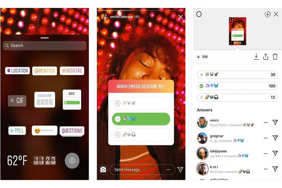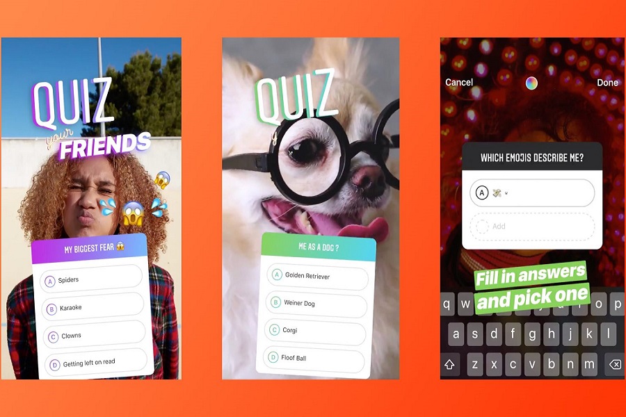 Το Instagram έχει προσθέσει ένα νέο αυτοκόλλητο «Κουίζ» στα stories έτσι ώστε οι χρήστες να μπορούν να τεστάρουν τους φίλους τους με διάφορες ερωτήσεις πολλαπλών απαντήσεων. Οι ακόλουθοι από την πλευρά τους επιλέγουν μια απάντηση και βλέπουν αν είναι σωστή ή όχι.
