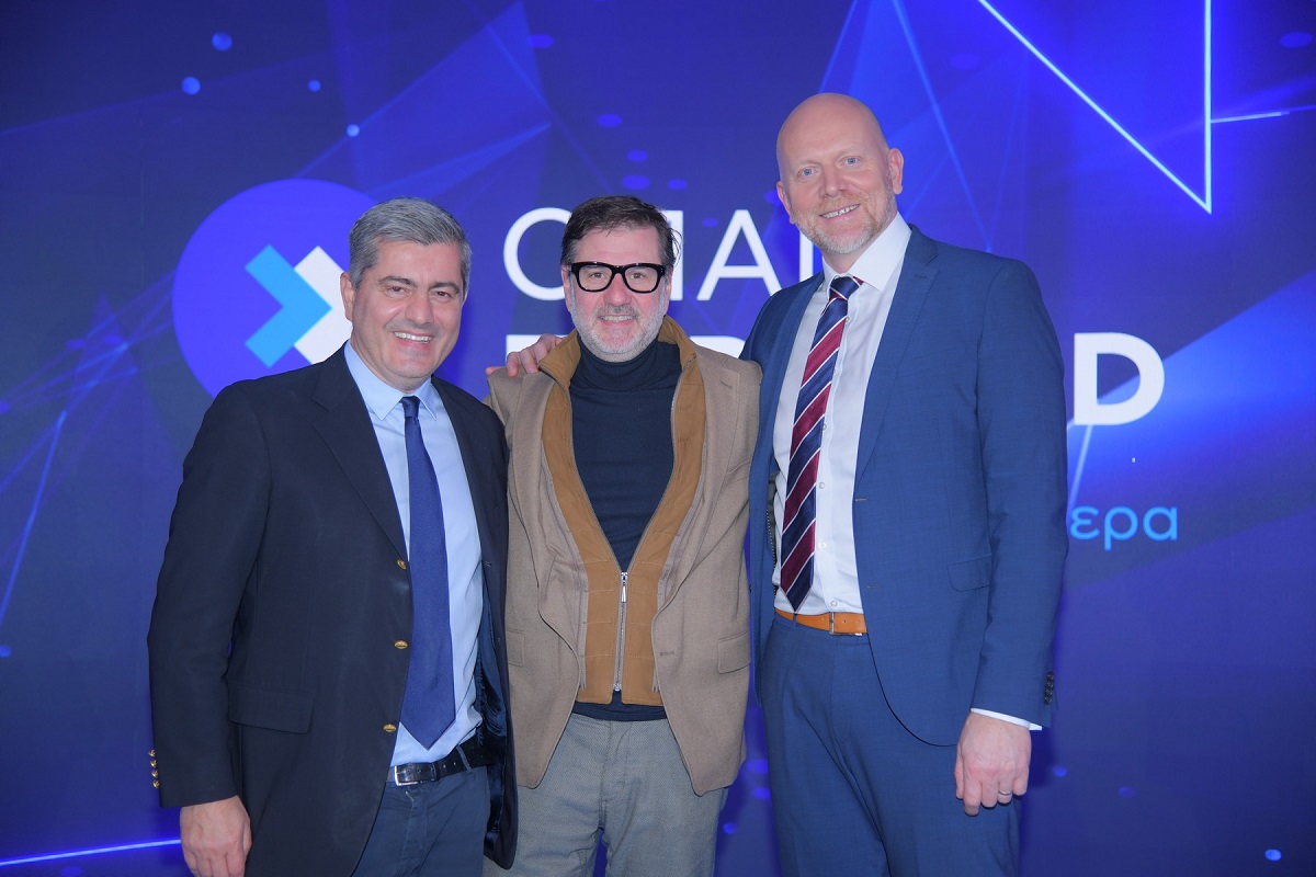 Ο Αναπληρωτής Διευθύνων Σύμβουλος του ΟΠΑΠ, Οδυσσέας Χριστοφόρου και ο Άγγελος Τσερέπας, Επικεφαλής Επιχειρηματικής Ανάπτυξης της εταιρείας Lariplast, που βραβεύθηκε για τη δημιουργία νέων θέσεων εργασίας.